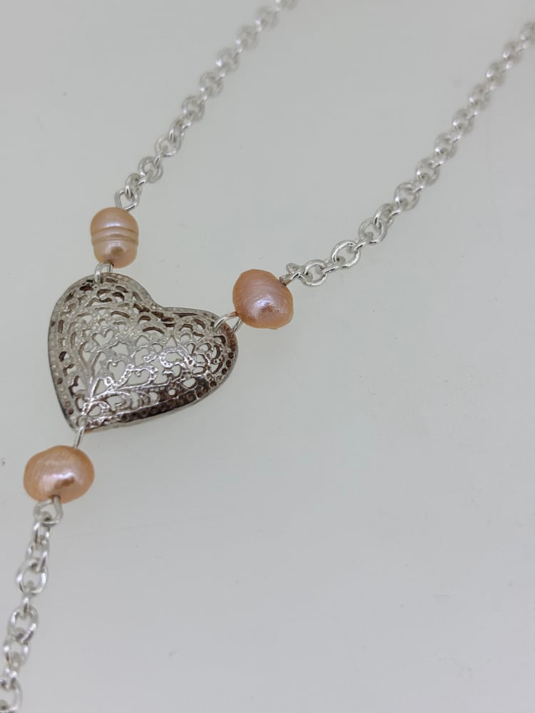 Sterling silver rosary with peach pearls, garnets, and hand cast recycled silver cross